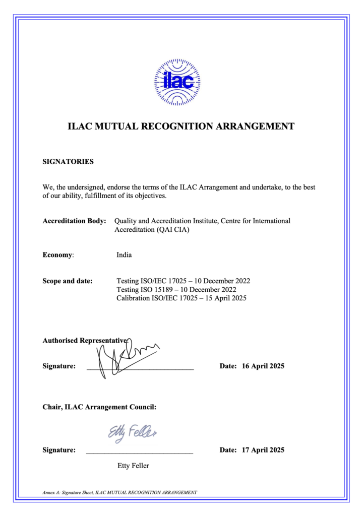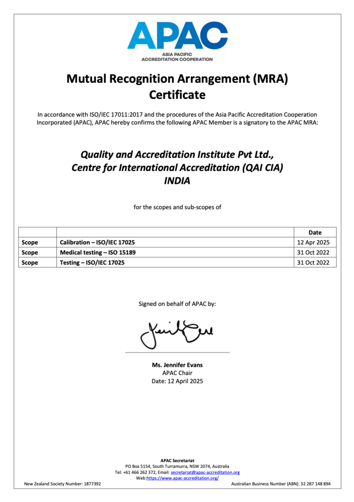 QAI CIA has achieved global recognition through APAC and ILAC MRA in Testing and Calibration (ISO/IEC 17025) and Medical (ISO 15189).